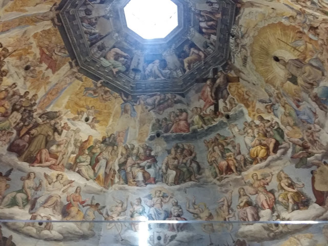 Inside the building we went up and up all over again. The stairs this time were much, much narrower and much, much steeper. Tall husband hit his head a few times. Because it was so steep and narrow, it was difficult to pass the folks coming down so every now and then we would have to stop and let a line of 20 or so people go down. This time there were no windows to add a bit of air every now and again so it just smells like humanity. The air is very still and swampy. On one of our first stops the lady behind us was trying to catch her breath bur couldn't so she was panting hard like a small dog. I have never heard a human make those sounds. She is over weight so that may have added to her trouble. She barely fit along the corridors. I understood why the ambulances were waiting at the bottom. We were just raining sweat as we ascended the hundreds and hundreds of stairs. It got more narrow and more steep. We broke out onto a landing inside the church finally and we got some air. I looked up and saw that we were standing at the base of the ceiling fresco that I wanted a closer look at earlier when we were in the church. There were all sorts of cool things to see in the massive painting. There was a man being torn apart by a beast. There was a goat demon. There were men climbing out of heavenly windows. It was great. I took a lot of photos. Before too long we were back inside the walls going up again. At the top we exited outside and walked along a catwalk that surrounded the top of the dome of the church. The views were best from this vantage. If you only want to go up one massive set of stairs in Florence, I recommend this one and not the tower. The dome is higher than the tower too so the views are completely unobstructed. We took in all the cool breezes and sights. We took videos and selfies and looked down at all the people in all the lines for the various attractions in the city then went back down. We walked around the octagonal shaped Baptistery but didn't go in. There was scaffolding surrounding it and I wasn't sure if it was even open or not. We did get to admire the golden doors. Last time I was in Florence we wanted to see the famous doors that are actually made of bronze and depict some kind of religious scene but when we arrived we just saw planks of plywood. The bronze part was out for cleaning. This visit the doors were there in all their golden glory. Now it is museum time....